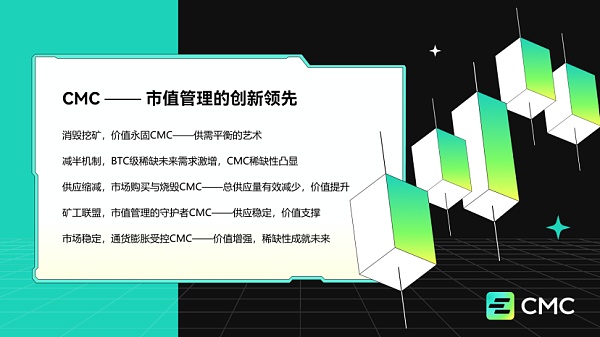 CMC的独特之处在于其通缩模型和逆向价值存储机制。在代币产出的过程中,必须使用原生代币进行销毁,从而提高了代币的稀缺性,并构建了基于实际贡献的价值存储逻辑。这一设计不仅使代币的价值更有实质性,同时也强化了对市场供需的刺激作用。通过避免资源浪费、通缩模型创新和流通量自主调控,CMC实现了对市场的有效控制。CMC的发行机制强调对真实贡献的肯定,社区在参与挖矿的过程中,必须使用原生代币进行销毁,这不仅提高了代币的稀缺性,也表明了对真实贡献的认可。这种机制激励经纪人积极参与项目,推动生态系统的健康发展。