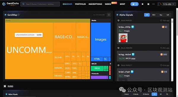GeniiData 更适合高阶用户,提供符文铸造功能和数据看板,使用户可以更好地管理和跟踪其符文交易。数据看板功能包括实时铸造进度、市场数据和交易信号。