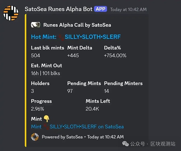 对于实时的符文打新热点跟踪和推送,satosea.xyz 的 Discord 机器人表现出色,提供全面的热点符文数据推送服务。