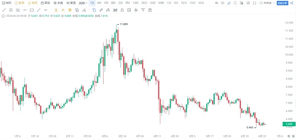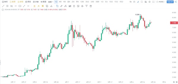 TON 现在已经成为 Telegram 平台上的支付手段,成功在 Telegram 上建立频道的影响人士可以获得 TON 作为奖励。这种加密货币日益增长的实际应用性,加上其知名度的提升,使得它成为当前牛市中表现出色的数字资产之一。自三月以来,TON 的价格经历了显著的上涨,突破了约2.00美元的盘整阶段。尽管最近加密货币市场的快速下跌导致 TON 的价格回撤至5.20美元的支撑位,但多头已利用这一支撑位将价格推回到看涨的三角形态中。
