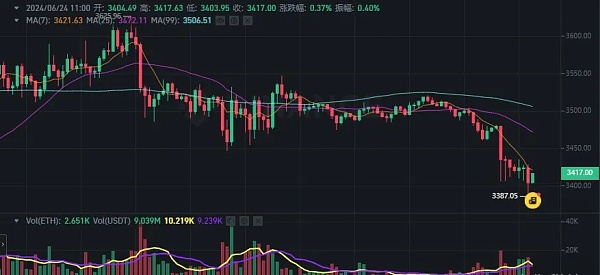 庄家手段愈发阴险,以太坊没有在周末下跌,反而选择在周一凌晨4点突破下跌至3400点以下。行情越发疲弱,比特币连续3个月阴跌,反弹高点一次比一次低。从周线级别来看,走势非常像M顶形态。以太坊唯一的利好预期是7月初可能通过的ETF,这使得其近期走势略强于比特币,但仍未摆脱下降趋势。那么,牛市还在吗?