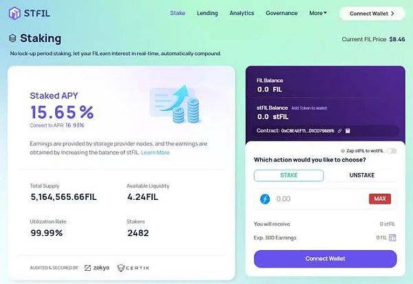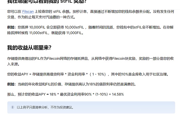 从这里可以看出来就是个质押生息的项目方,你抵押FIL币,然后呢,可以获得利息或者是代币,利息竟然高达15%左右。