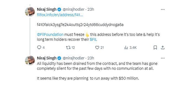 随着资金被“神秘”转移到“未知名”的地址,辛格呼吁Filecoin基金会,必须在为时已晚之前冻结该地址,并帮助其长期持有者收回其FIL代币。