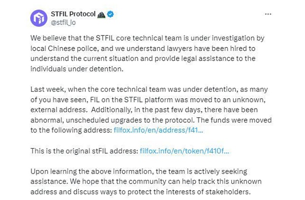 Filecoin生态LSD协议STFIL Protocol周二(4月9日)证实,其核心技术团队正在接受中国警方拘留。官方团队向加密社区寻求协助,称在被当局调查期间,平台资金遭异常转移。