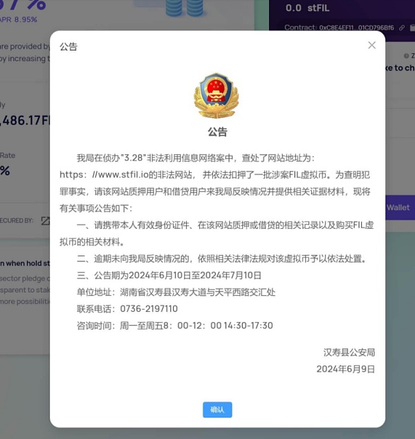 6月24日消息,据STFIL Protocol官网公告,Filecoin生态的LSD协议STFIL Protocol因涉及“3.28”非法利用信息网络案件,STFIL Protocol官方网站已被湖南省汉寿县公安局查处,并依法扣押了一批涉案FIL虚拟币。公告要求该网站的质押用户和借贷用户在2024年7月10日前,携带有效身份证件及相关记录到汉寿县公安局反映情况并提供证据材料,逾期未反映情况的虚拟币将依法处置。