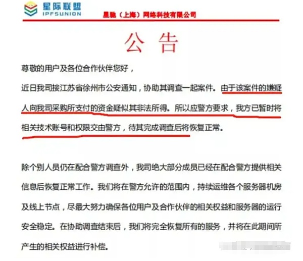 2021年11月,从事Filecoin的虚拟货币托管挖矿业务的FIL矿商星际联盟被徐州市公安局丰县分局抓获,原因是涉嫌组织、领导传销活动,以高额回报为诱饵,通过网络平台招募会员,实施非法集资。