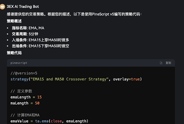 3EX平台的AI功能允许用户通过简单的文字描述来自动生成交易策略。我会将自己的交易想法和预期的市场动向输入平台的AI系统,如“搜索当EMA15上穿MA50,并且MACD和RSI显示底部背离的情况”。AI系统会根据这些描述分析历史数据,自动识别相似的市场条件,并生成相应的交易策略。生成策略后,我可以根据提示完成,策略名称、交易币种、交易K线周期等信息。这种方法使得策略更加客观和科学,减少了人为误差的干扰。