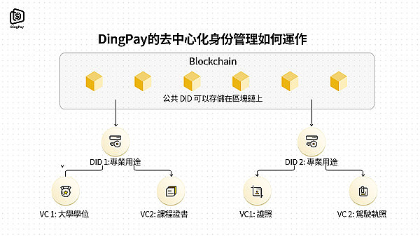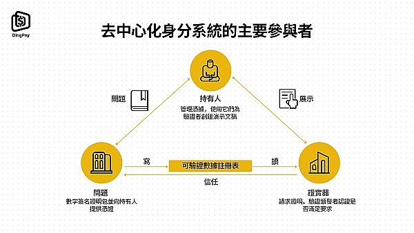 用户/持有者(holder):拥有和使用身份信息的个人。这些用户可以在DingPay中保存各种标识符,并根据需要共享它们。