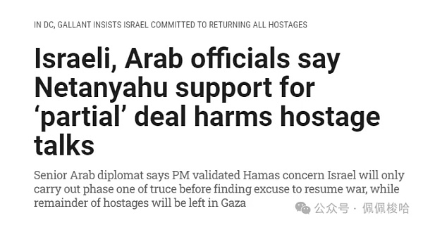 《以色列时报》(TOI)报道,一位来自调解国的阿拉伯高级外交官周一透露,内塔尼亚胡周日晚间声称,他只支持与哈马斯达成部分人质协议,即在释放女性、老年人和病人质后,以色列可以恢复与该恐怖组织的战斗,这给谈判带来了损害。