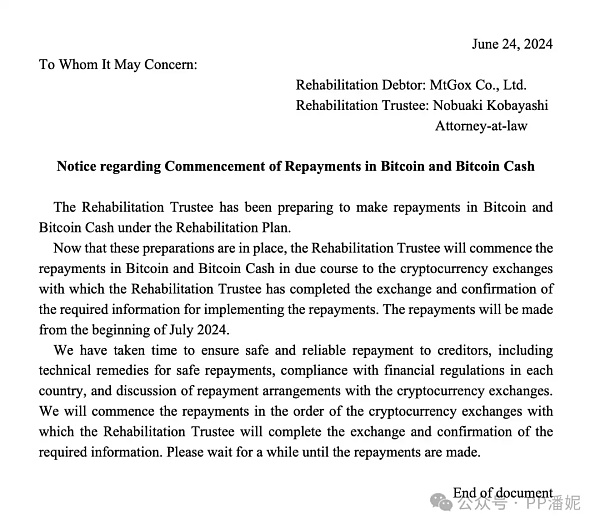结合当时 Mt. Gox 破产清算人小林信明的邮件通告可知,该部分赔偿资金来自于小林信明于 2023 年 11 月 17 日从破产信托中赎回的 70 亿日元。