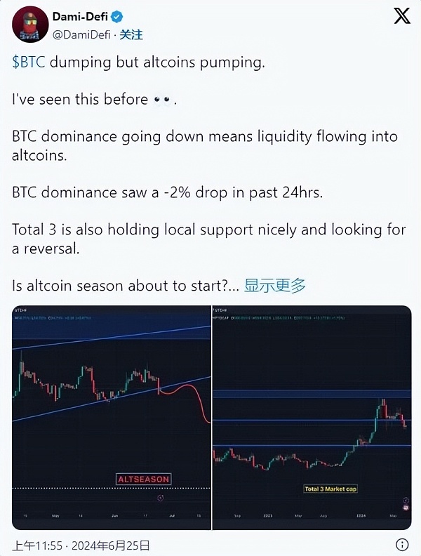 “Total 3指数”,涵盖了比特币和以太坊在内,展现出强劲的支撑力,预示着趋势将要逆转!这样的发展不禁让投资者开始质疑,山寨币季节是否即将开启,是否会掀起一场前所未有的暴涨风暴!