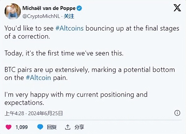 “比特币是山寨币的地表之王,而不是 USDT!”Poppe声称,仿佛传授出了一场加密世界的神秘奥秘。“我们目睹着多个信号的涌现,预示着我们可能已经逆转了!”他激动地表示,他所指的信号是山寨币对比特币的当前走势,这可是带着一股神秘色彩的暗示!