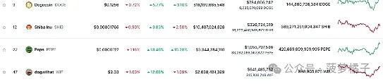 模因币通常被称为加密货币的狂野一面,在比特币小幅回升之后,模因币也出现了大幅上涨。领涨的是狗狗币,一些模因币实现了两位数的涨幅。那么,模因币市场现在的情况如何呢?