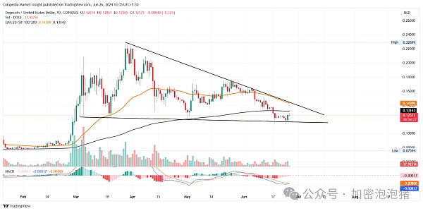 DOGE 价格的下行趋势形成下降楔形模式,并且负周期在 200D EMA 下方突破。尽管如此,该 meme 代币仍维持在 0.10 美元心理关口上方的主导地位。