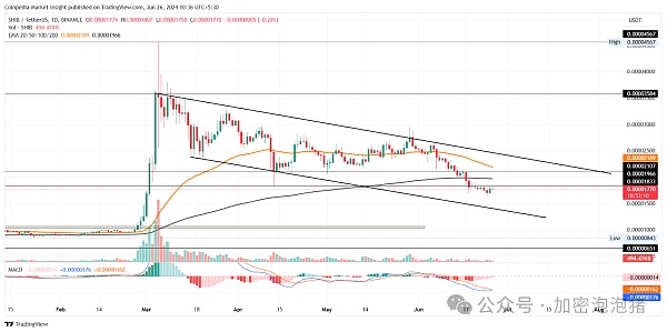 在滑坡上,柴犬代币在日线图中显示出下降通道。此外,在 52W 高点形成 0.00004567 美元后,下跌的 meme 代币跌破 200D EMA,威胁日线图中的死亡交叉。