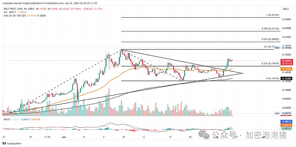 BRETT 价格走势长期保持看涨趋势,形成稳固的支撑趋势线。在 4H 图中,看涨趋势在超越短期阻力趋势线时呈现三角形模式突破。
