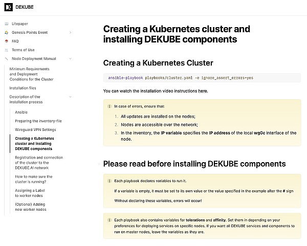 Token分配及测试网激励方案:根据DEKUBE的代币分配方案,测试网及服务节点、计算节点将总计获得20%的测试代币,这些代币需在主网发布后批量兑换为主网代币。其中,测试网活动产出占7.5%,限积分活动前10,000名合格参与者,TGE主网发布后代币在12个月内线性产出。主网上线前,保障整个网络平稳运行的服务节点产出占5%,用于任务管理并确保基础网络稳定性和安全性,TGE主网发布后代币48个月线性发放;计算节点产出占总量7.5%,将用于GPU集群协同和AI测试任务的基础算力供应和保障,TGE主网发布后代币将12个月线性排放。节点部署的技术文档可以在官网查询。主网代币发行占到80%,届时将通过全网GPU PoW的方式产出,详情将于官网/官推稍后公布。