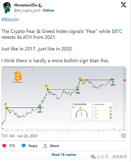 市场分析师Moustache 指出,过去加密货币恐惧与贪婪指数发出“恐惧”信号,而比特币重新测试了前一个周期的历史高点,这为未来的价格表现提供了强烈的看涨信号。