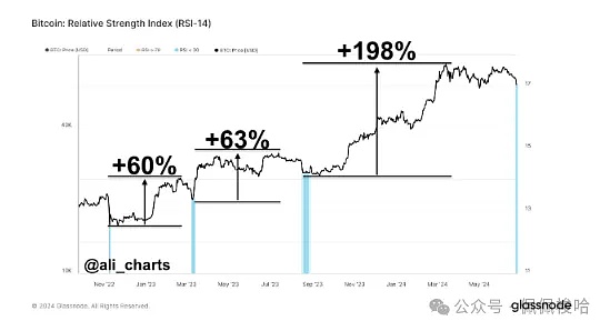 市场分析师阿里·马丁内斯(Ali Martinez) 发布了以下图表,重点介绍了比特币的相对强弱指数(RSI),表明之前进入超卖区域的抛售之后出现了两位数的百分比增长。