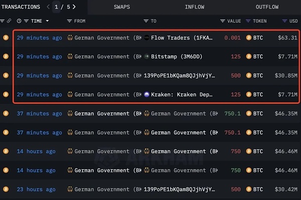 根据数据,过去一个月内,德国政府已经陆续转移了价值约1.5亿美元的比特币至Bitstamp和Kraken交易所,后续清算直接冲击了比特币的价格走势。这些交易使德国政府在全球政府持有比特币的排名从第二跌落至第五位。