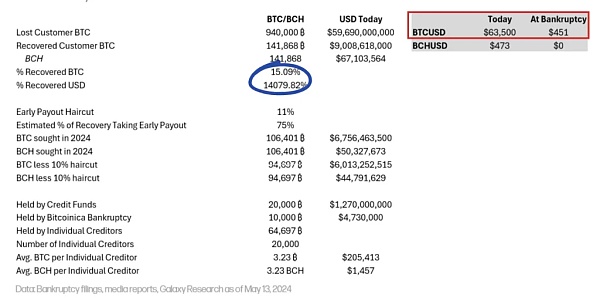 如果债权人选择提前赔付,只能领到九成的比特币(10%haircut),Galaxy预期会有75%的债权人选择这个选项,也就是会有约95K的比特币提前支付给债权人。其中,20k的比特币属于索赔基金、10k属于BitcoinicaBK,剩下的65k为独立债权人。