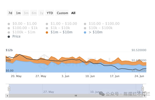 Cardano (ADA) 上个月的大额交易量有所下降。例如,在此期间,价值在 100 万美元至 1000 万美元之间的 ADA 每日交易量下降了 33%。
