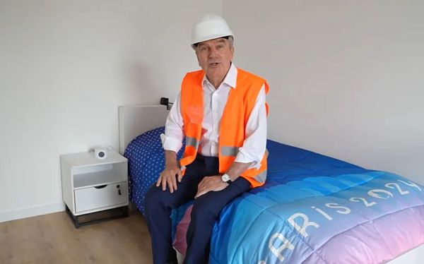 (国际奥委会主席巴赫去年视察奥运村时特意测试了一下床,来源:IOC Media)