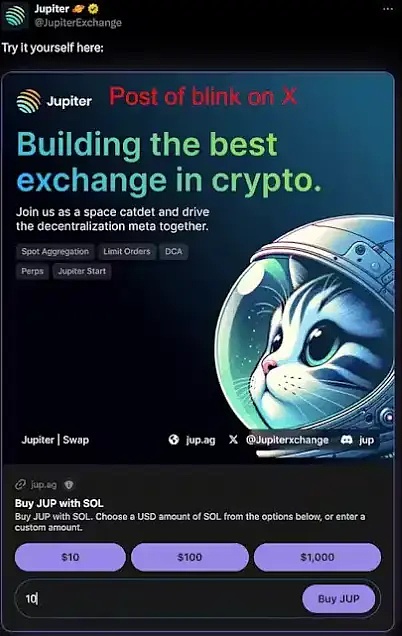 Jupiter 也分享了一个实时示例,通过 blink 让用户使用 SOL 购买 Jupiter 代币。