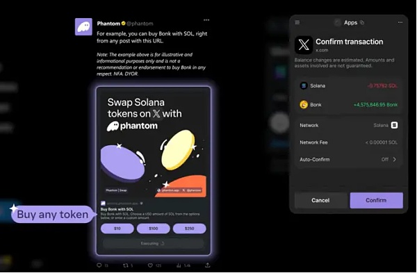 Phantom在其官方社媒上分享了一个实时示例,通过 blink 让用户使用 SOL 购买 Bonk。