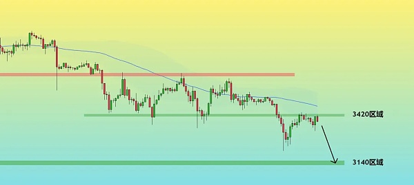 昨天比特币最低跌至3325后,迅速反弹到3420阻力区域,但未能突破。这表明下跌趋势仍未改变,"反弹空" 依旧是主要策略。短期内,我给出的下跌目标依然是TP1:3280区域,TP2:3140区域。
