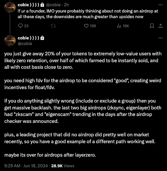 加密 KOL Cobie 关于“空投已死”的讨论,他认为现在空投现状很难满足用户的需求,其口碑很容易被小错误反噬,项目方或许可以尝试不发空投等更好的上市方式。