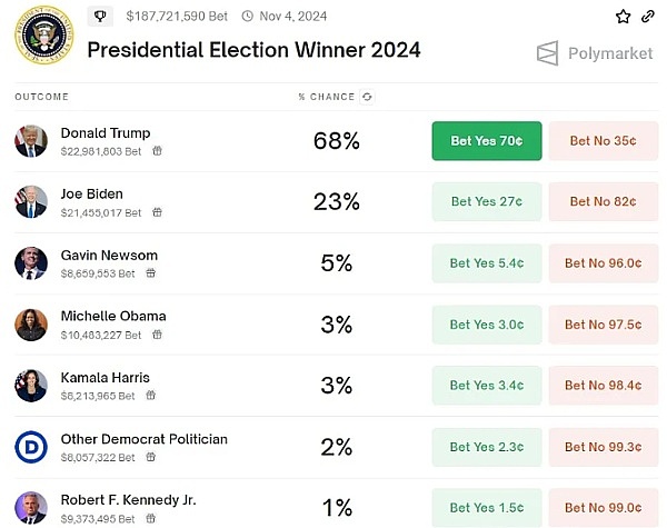 比特币短线上冲最高触及62212美元,随后微幅下滑,美元指数重新站上106。美国第一场总统大选电视辩论中,市场认为共和党总统候选人特朗普(Donald Trump)占优。据Polymarket数据,特朗普胜率快速突破68%。