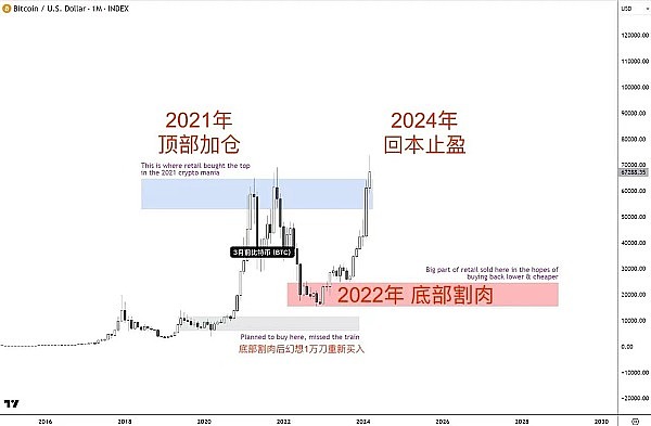 当时画这个图的时候,才刚刚伸出了一个强势信号SOS的针。现在3-6月的震荡洗盘,果然在6-7万刀这个区间增添了几根来来回回的月线,从而画出了威科夫模式的阻力位震荡“弹簧线”(下图红框位置)。