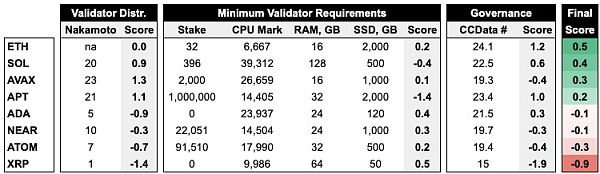 GSR 认为,这两个因素中,去中心化更多的是一个门槛因素,而潜在需求可能是发行商使用的主要标准,因此分别以 33% 和 67% 的权重计算两者得分。在将两个数据相加后, GSR 得出的最终结果是,以太坊以较大优势排名第一,其次是 Solana 和 NEAR。与第三名 NEAR 的得分相比,SOL 与之拉开了较大的差距。此外,SOL 也是除 ETH 之外唯一在去中心化和需求方面都获得正分的加密货币。