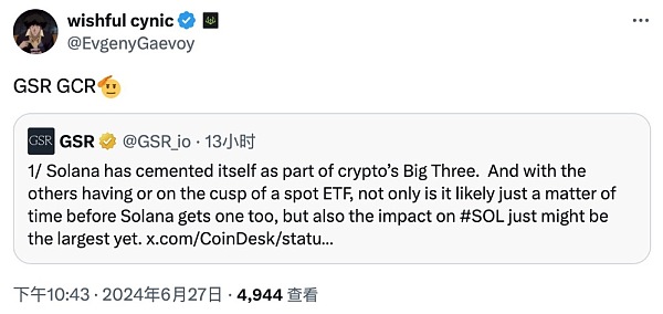 对于 GSR 的分析,Wintermute 创始人及 CEO Evgeny Gaevoy 戏谑其为传奇交易员「GCR」。Evgeny 阐述了自己不看好 SOL ETF 获批的理由。他表示,「SOL ETF 在今年获得批准的可能性几乎为零。一厢情愿地认为它会被特朗普政府优先对待是非常愚蠢的。看看以太坊 ETF(今年)的资金流入量有多么少,你就会明白,即使 SOL ETF 获批,它的资金流入量只会更少。」Evgeny 补充称,Wintermute 也做多 SOL 和 ETH,发表上述观点只为实事求是,「加密货币的采用需要时间。」