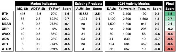 需求方面,GSR 基于以下三类指标进行了分析,得出需求得分高于平均水平的三个区块链分别是以太坊、Solana 和 NEAR。