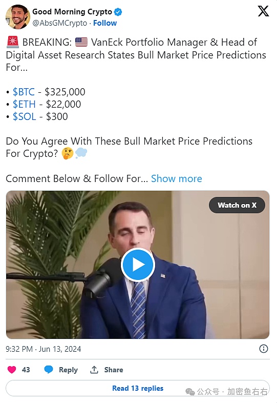 在回答 Pompliano 的问题时,Sigel 证实 VanEck 的研究表明比特币看涨,目标价为 325,000 美元。此外,他还提到了 VanEck 最近的预测,即为以太坊设定了 22,000 美元的目标价。