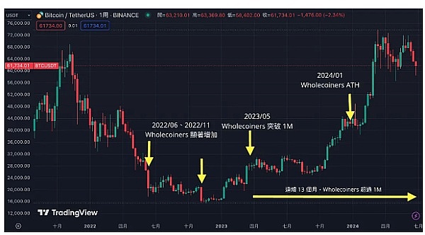 另一方面,在2022年比特币价格下跌超过65%的期间,wholecoiners数量激增,最显著的增长发生在6月的市场崩盘期间,以及11月FTX倒闭并申请破产之后的时期。