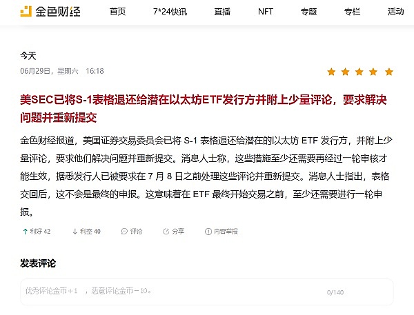 重磅 以太坊ETF延后 美SEC已将S-1表格退还给以太坊ETF发行方
