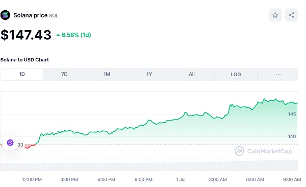 加密货币SOL 的价格上涨 6.58%,交易价为 147.43 美元。其 24 小时最低价和最高价分别为 137.14 美元和 148.65 美元。