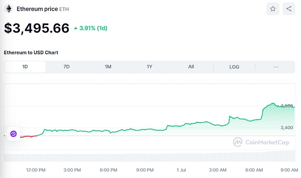 同样,ETH 价格在过去一天飙升 3.91%,达到 3,495.66 美元。其 24 小时最低价和最高价分别为 3,354.51 美元和 3,516.05 美元。随着 ETH ETF 即将推出,这一上涨势头引起了投资者的极大热情。