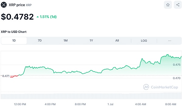 Ripple Labs 支持的代币XRP价值上涨 1.51%,达到 0.4782 美元。其 24 小时最低价和最高价分别为 0.4703 美元和 0.4788 美元,凸显出交易时段紧张。