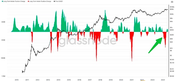 当前的调整主要是以矿工为代表的一部分长期投资者进行了抛售,观察持有比特币超过 155 天的长期持有者头寸变化,可以看出ETF通过后的1-3月份上涨,有很多长期持有者进行了卖出操作,不过,目前长期持有者又进行了重新买入的操作。