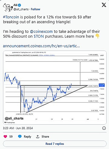 著名加密货币分析师 Ali Martinez 表示,TON 可能即将创下历史新高。该分析师预计,TON 在突破上升三角形后将达到 9 美元大关。从当前价格来看,达到 9 美元将意味着增长约 18.27%