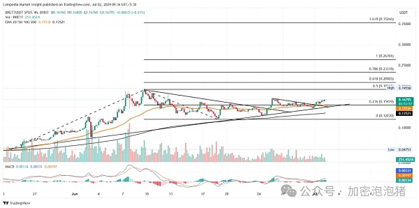 根据基于趋势的斐波那契水平,BRETT 代币可能达到 1.618 水平,价格为 0.35 美元。目前,该 meme 代币的交易价格为 0.16 美元,本周上涨了 7.25%。