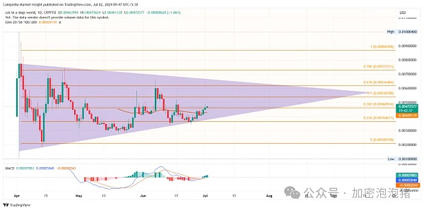 随着波动性下降,MEW 代币在日线图中呈现三角形形态。在 23.60% 斐波纳契水平的支撑下,双底反转预示着 meme 代币将进入上涨周期。