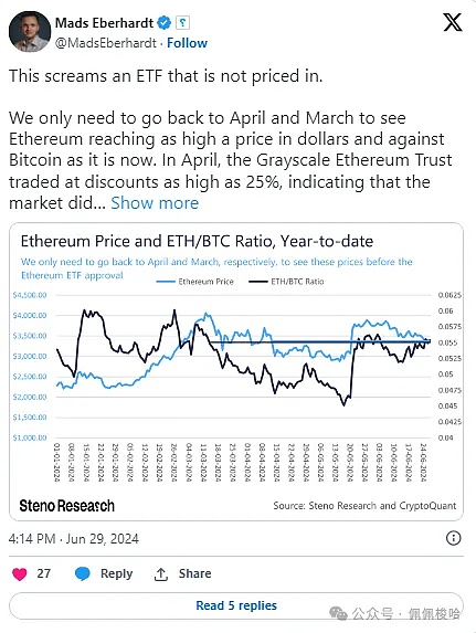 Steno Research 分析师Mads Eberhardt 在 X 上指出,ETH 较早前的年度高点下跌了 15%,这“表明 ETF 尚未定价”。