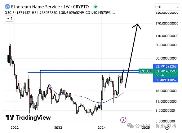 ENS 目前正在 30-33 美元区域的长期阻力位进行探索,根据CoinMarketCap的数据,ENS 在过去 24 小时内上涨了 14% 。