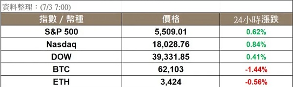 随着美国联邦储备委员会主席鲍威尔释放出鸽派信号,美国股市主要指数在周二(7/2)全线收涨。特斯拉股价飙升超过10%,标普500指数创下了今年以来的第32个收盘新高。道琼斯工业平均指数上涨了0.41%,纳斯达克综合指数上涨了0.84%,再次刷新了历史最高水平。然而,比特币和以太币的表现依然疲弱,并未随着美股的上涨而反弹。