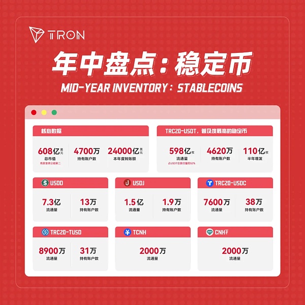 DefiLlama数据显示,截至6月30日,全球稳定币市场总市值超1610亿美元,而流通在波场网络上的稳定币市值高达608亿美元,占稳定币总市值的37%,位居全球公链第二。此外,截至6月末,波场链上稳定币持有账户数超4700万,年度转账额超24000亿美元,波场TRON已成为全球重要的稳定币支付网络。